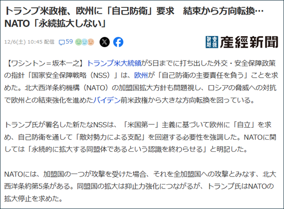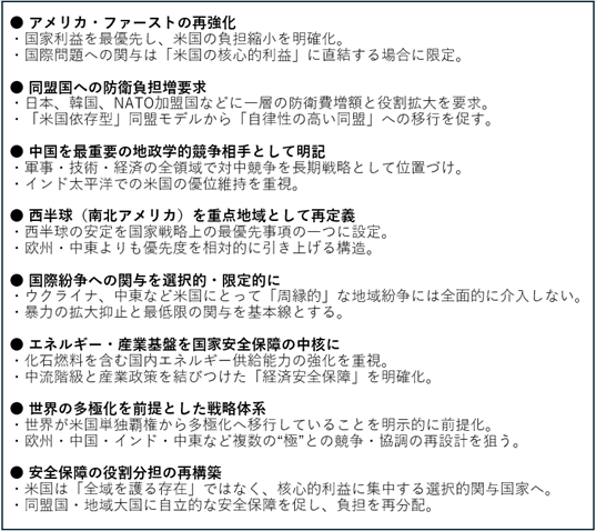 今回発表されたNSSは、「MAGA」「自国ファースト」「米覇権放棄」「世界の多極化」「左翼政策批判」等、トランプ色が濃い内容になっている。