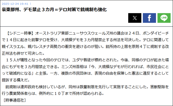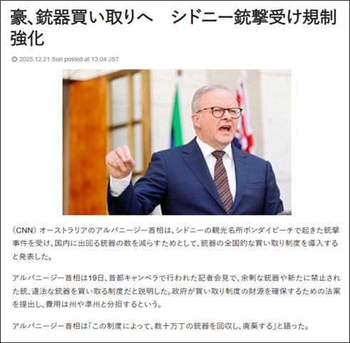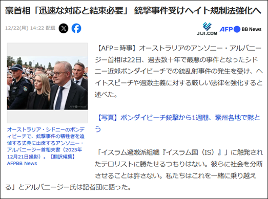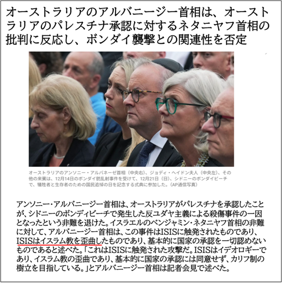 … … …(記事全文1,983文字)前々回の配信でお伝えしたように、ネタニヤフは、ボンダイビーチ銃撃事件はオーストラリアのパレスチナ国家承認、すなわち反ユダヤ主義(≒イスラム主義)の容認が背景にある、と非難した。これに対しオーストラリア首相は「事件とパレスチナ承認は関係ない」「ISIS(イスラム国)はイスラム教を歪曲したものでイスラム教徒が悪というわけではない」「ネタニヤフの批判は内政干渉」と強く反発する一方で、反ユダヤ主義に限定しない広範な言論弾圧と銃規制を強めている。