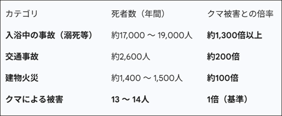だが、熊の被害を受けた地域や住民は日本全体のほんの一部であり、死者数でいえばわずか13人に過ぎない。