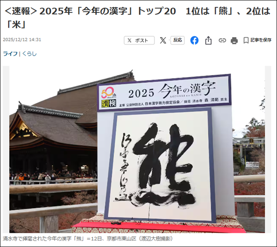 2025年を表す漢字は「熊」が選ばれた。全国各地で被害が相次いだことが反映された形だ。