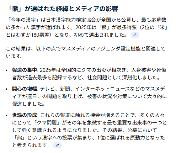大手メディアがアジェンダ設定機能で隠したかったことは、「高」「米」に象徴される我々市民の「生活の苦しみ」であり、「熊」は大手メディアや政府の責任追及のリスクがない「安全で便利なスケープゴート」に過ぎない。