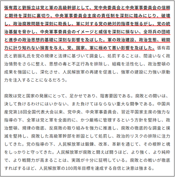 確かなことは、張又侠と劉振立が失脚したこと、そして、2人に対する中国当局の批判は過去に類を見ないほど激烈であったことだ。2人の失脚を伝える新華社通信の記事は、単なる汚職の指摘を超えて「政治的裏切り者」として徹底的に断罪する言葉で溢れていた。現在の中国共産党における最大の「政治的裏切り」とは、「習近平に対する反対」を意味する。