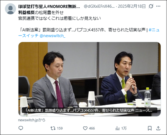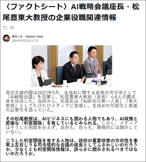 松尾氏は、教え子たちが起業したベンチャー企業群の株主や技術顧問、さらにはソフトバンクグループの社外取締役を兼任する傍ら、政府の「AI戦略会議」の座長という要職にも就いている。政府のAI関連予算の配分や、規制・推進の方向性を決定づける立場にありながら、自らに関連する企業群に利益をもたらし得るその立ち位置は、以前から「利益相反」や「談合・癒着」の疑いが色濃く持たれている。