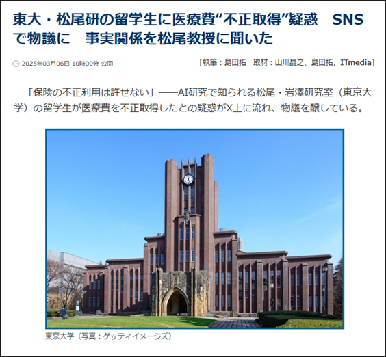 この他にも、昨年3月に松尾研究室の中国人留学生が日本の医療保険で1300万円を騙し取ったという真偽不明のSNSが拡散して物議を醸した。東大は中国人留学生が他大学と比べ突出していることとも相まって炎上し、国会でも取り上げられる騒動に発展した。