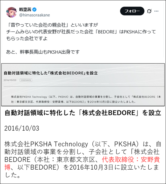 その代表的な一社が、上野山勝也氏が創業したPKSHA Technologyである。上野山氏は安野氏の先輩にあたり、安野氏自身も「チームみらい」を結成する前は、その子会社であるBEDORE(ベドア)の代表取締役を務めていた。