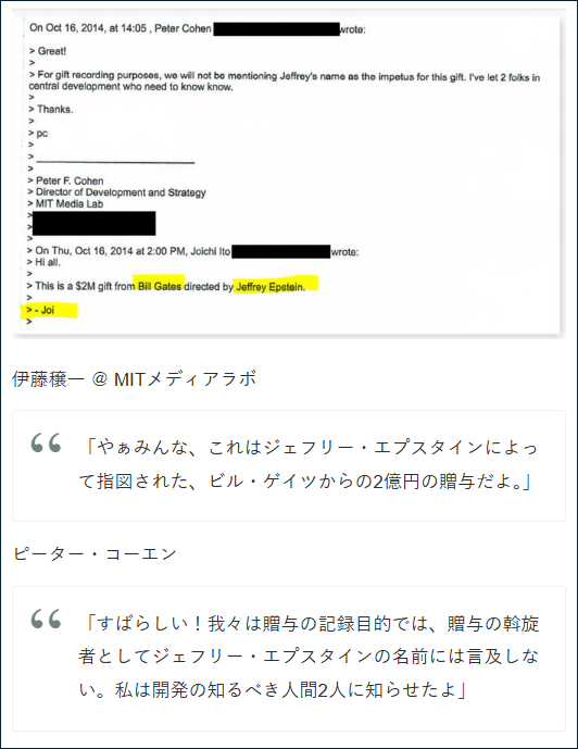 <伊藤氏とメディアラボ開発ディレクター、ピーター・コーエンのメールのやりとり。エプスタインにカネを無心してエプスタインの“親友”ビル・ゲイツから200万ドルの資金を受け取り、エプスタインの名前を隠すことを画策していた>