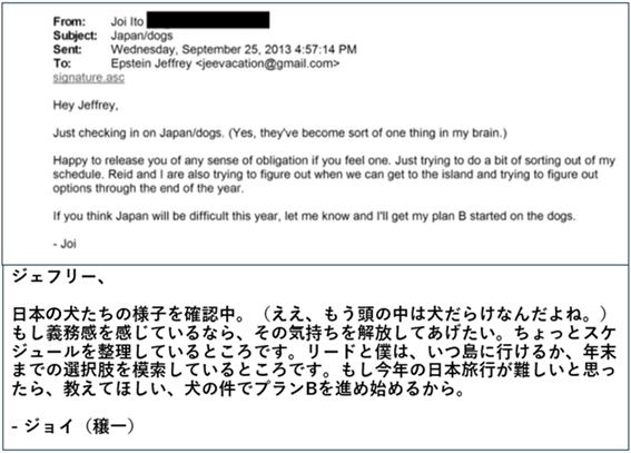 <伊藤氏がエプスタインに送ったメールの一部。「犬」はエプスタイン文書で使われていた隠語で、幼い少女、あるいは少年のことだと言われている>