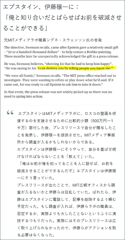 “改めて”とは、エプスタインと伊藤穣一氏のただならぬ関係はすでに2019年に米国の雑誌「THE New Yorker」で報じられており、それが原因で伊藤氏はMITメディアラボ所長を辞任させられているからだ。