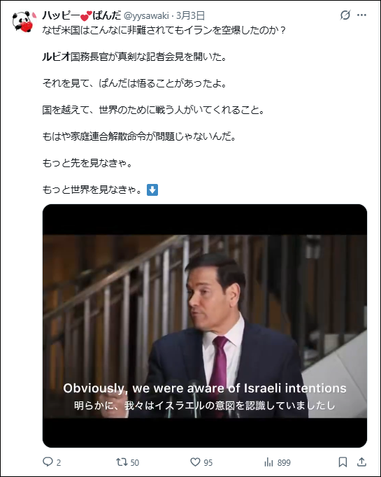 <ルビオ国務長官「我々はイスラエルの意図を認識していた」>
