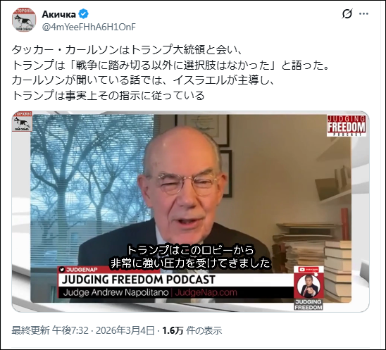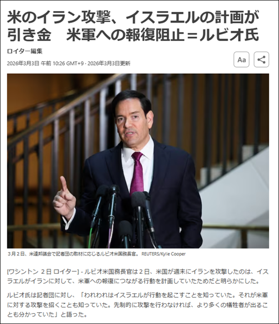 ルビオのこの発言は、トランプ政権がイスラエルの傀儡であることを暗に認めるものだ。それに気づいたトランプは慌ててイラン攻撃の理由を改めて説明したのだ。