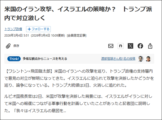 だがそれらは表向きの理由でしかない。トランプの説明の前にルビオ国務長官は「イスラエルがイランを攻撃する計画を知っており、それによりイランが米軍に報復攻撃を仕掛けてくることが予想されたため先制攻撃した。」と語っている。ルビオは、イラン攻撃はイスラエル主導で米国は付き合わざるを得なかったという。