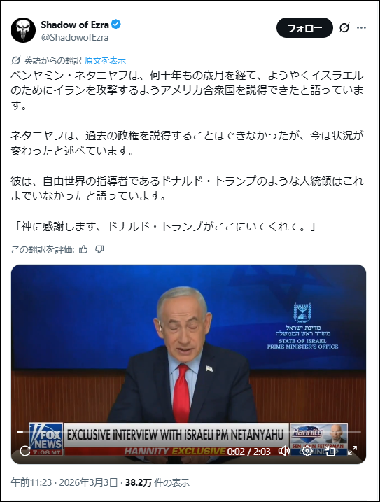そんな二人にはお構いなしに、イスラエルのネタニヤフ首相は、「何十年もイランの脅威を警告し続けてきたが、ようやくトランプ政権が応えてくれた。」とイスラエルが米国にイラン攻撃を迫ったことをあっさり暴露した。