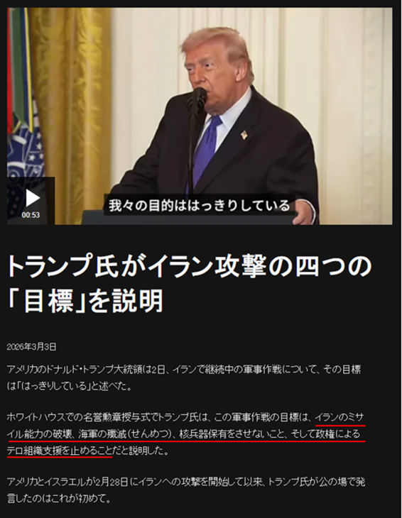 今回のイラン攻撃の目的について、トランプは「イランのミサイル能力破壊」「海軍殲滅」「核兵器を保有させない」「テロ組織支援の撲滅」と説明した。