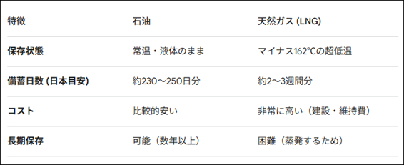 <天然ガスは備蓄コストが高いため、石油に比べて備蓄量が少ない>