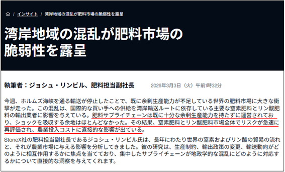 結果として、肥料には「国家備蓄」という概念がほとんど存在しない。ホルムズ海峡封鎖により輸送船が途絶えた瞬間、世界はあっという間に肥料不足と価格高騰の嵐に飲み込まれる。