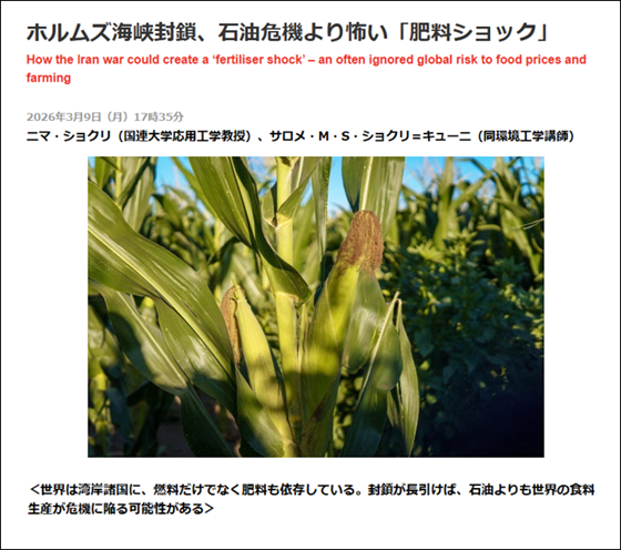 … … …(記事全文2,547文字)米イスラエル・イラン戦争の戦火が上がってからついに1カ月が経過した。米国とイランは共に終戦への提案を掲げているものの両者の溝は深く、ロシア・ウクライナ戦争の泥沼化を彷彿とさせる停滞が続いている。こうした中、世界がいま直面しているのは、単なるエネルギー危機ではない。人類にとってより根源的な脅威「食糧危機」だ。