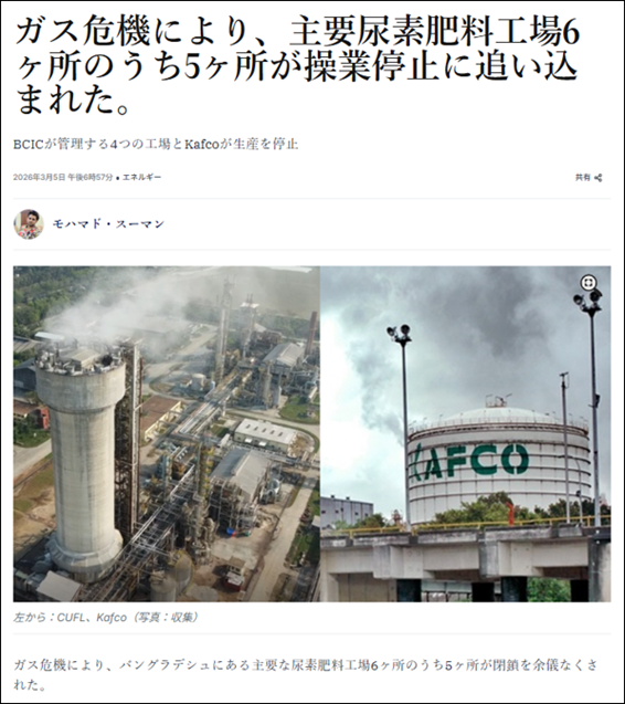 <2026年3月5日 The Daily Star バングラデシュでも尿素製造が停止>