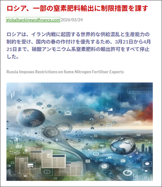 さらに世界の肥料危機を深刻化させる恐れがあるのが世界最大の窒素肥料輸出国であるロシアの動向だ。先日ロシアは、自国の農業保護を名目に窒素肥料の輸出を制限すると発表した。