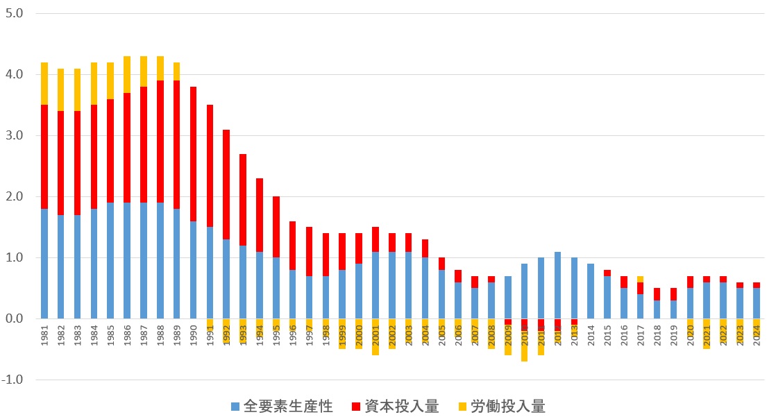 バブル崩壊以降、労働投入はマイナスに転じた。とはいえ、資本投入と生産性向上により日本経済は成長を続けたのである。
