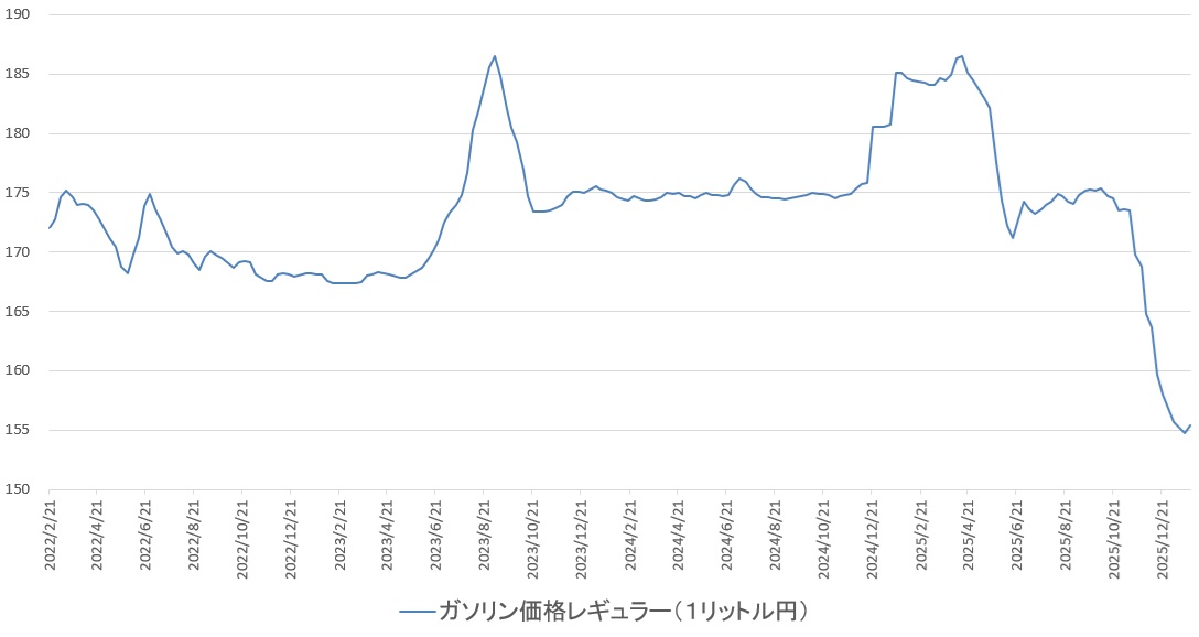 【日本のガソリン価格(レギュラー)の推移(1リットル円)】