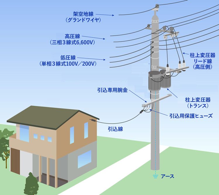 ※6600Vで送られてきた電力線のうち2本を変圧器に入れ、単相3線200V(中央は中性線)で家庭に引き込みます。3線の外側2本を使うと200V、中性線と外側線だと100Vが取れます。
