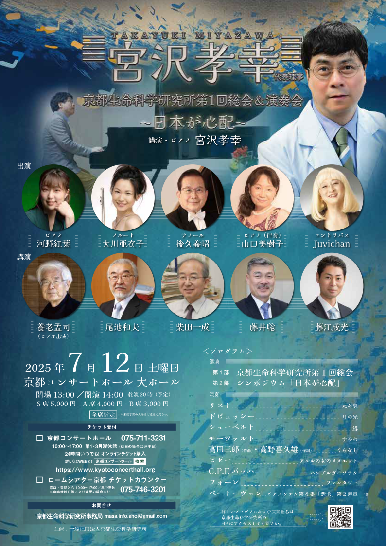 2)7月12日(土)に京都コンサートホールで京都生命科学研究所第1回総会&演奏会を開催します。プログラムとチケット購入方法はこちらになります。