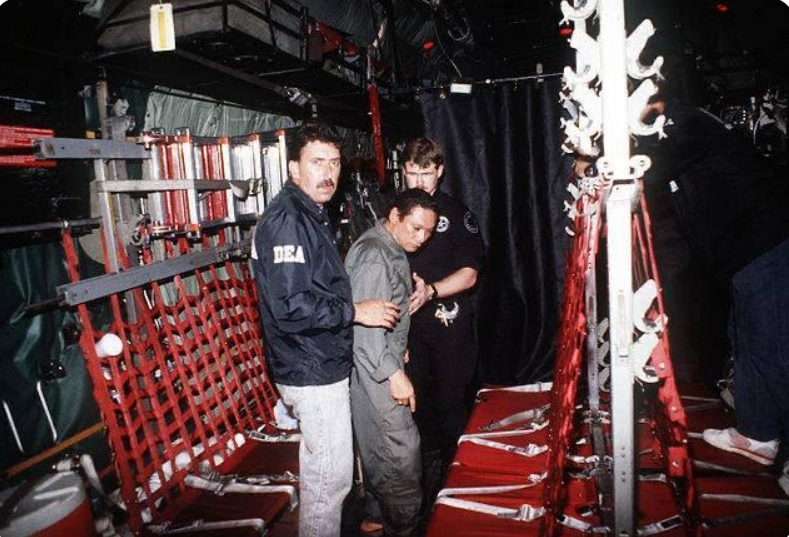 このベネズエラ侵攻、米国の作戦名「Operation Absolute Resolve」、日本語に訳すと「絶対的決意作戦」、「確固たる決意作戦」という軍事作戦が決行されたのは1月3日のことでした。ちょうど今から36年前の1990年の1月3日、ブッシュ・シニア政権下のパナマで米国は「正義の道作戦」なるものを展開し、パナマ侵攻を行い、当時のノリエガ大統領(※写真中央)を投降させ、拘束しました。そしてノリエガ大統領もマドゥロ大統領と同様に麻薬密売幇助の容疑で告発されました。つまり政権や作戦名、相手国は変わっても、政権転覆のやり方は全く同じで変化がない・・・。これが先ほど述べた通り、米国という国家なのです。