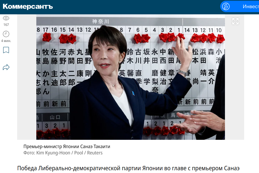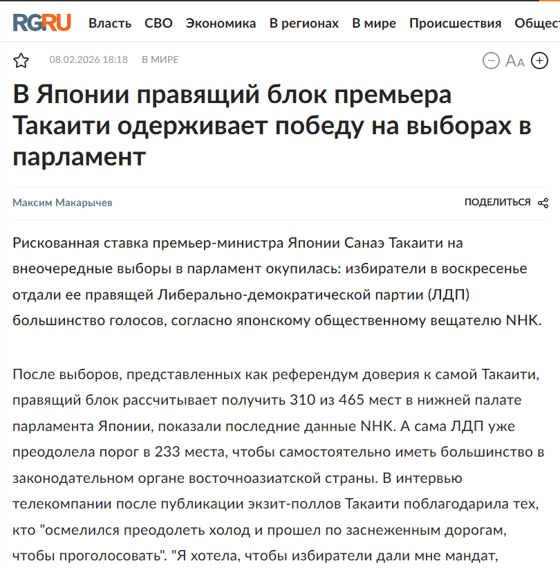 本題に入る前に、8日日曜日に幕を閉じた日本の衆議院議員選挙について、ロシアではどのように報じられたのか?についてお伝えしたく思います。今回の選挙では高市首相の自民党が圧勝したこともあり、深堀りの長尺記事ではないとしても、日本ネタとしては、かなりロシアのメディアに取り上げられた方だと思います。その中から3つほど記事をご紹介します。