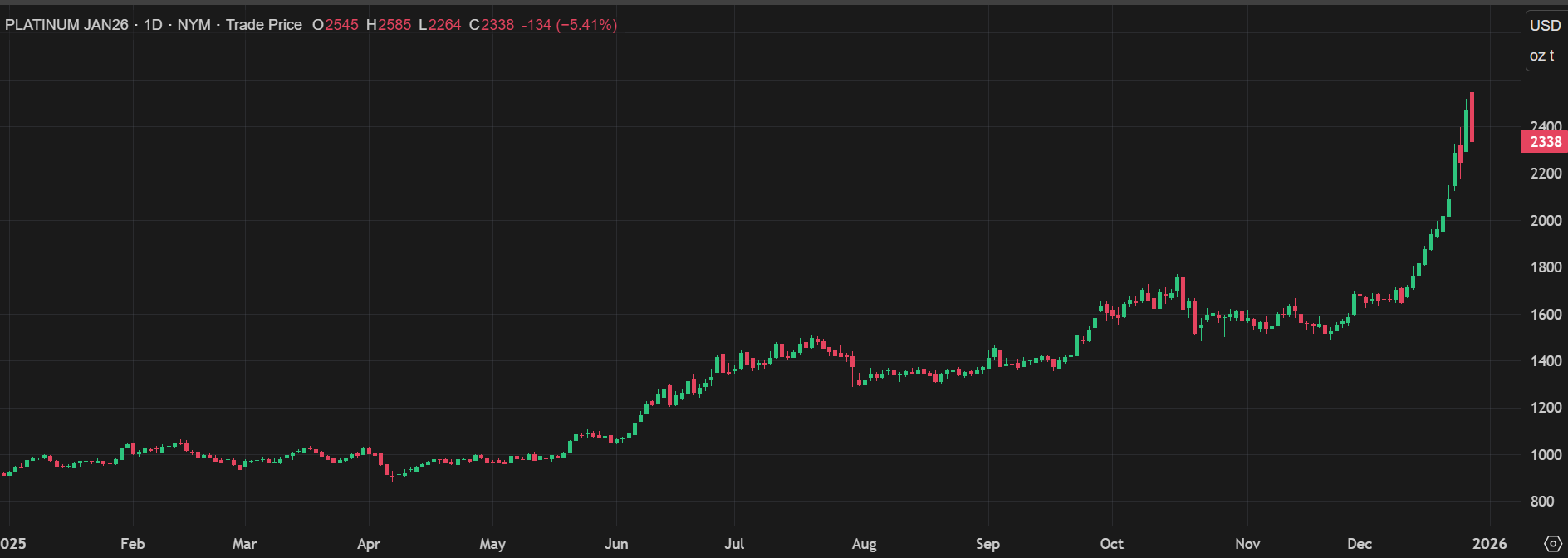 2025年のNYMEXプラチナ先物相場は、12月26日時点で前年比171.2%高の1オンス=2,471.40ドルと急伸した。ここ数年のプラチナ相場は、金相場が大きく上昇しても1,000ドルの節目水準で膠着化しており、明確なトレンドを形成できない状況が続いていた。生産コストの論理もあって1,000ドル割れからの値崩れが回避される一方、1,100ドル水準では買いが続かずに、上値の重さを確認する展開が続いていた。しかし、25年は5月下旬から買い圧力が強まり、7月には1,500ドルの節目を上抜いた。その後も9月に1,600ドル台、10月に1,700ドル台とじり高というにはあまりに大きな値幅の展開が続いた。
