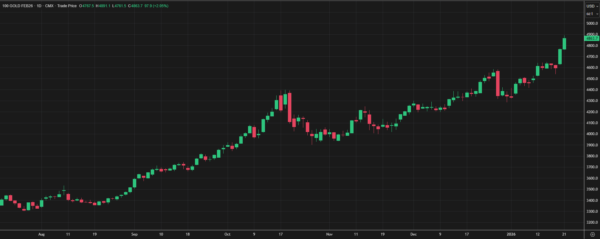 金相場の高騰が止まらない。2026年のCOMEX金先物相場(1月20日時点)は13営業日中、5営業日が過去最高値を更新している。1月5日、12日、20日と週明け(連休明け)のタイミングで急伸する傾向が目立ち、前日比で100ドルを超える値上がりになった営業日も3日ある。特に1月20日は前日比170.40ドル高となったが、これは過去最大の上昇幅になった。