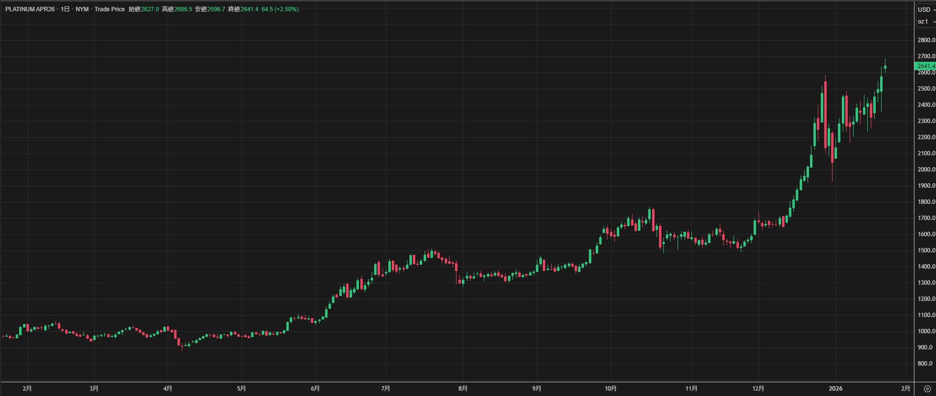 NYMEXプラチナ先物相場が過去最高値を更新した。昨年12月下旬の急伸地合で12月29日に過去最高値となる2,584.50ドルまで急伸した後は、過熱感から調整売りが上値を抑える展開が続いていた。地政学リスクの高まりを背景に金・銀相場が過去最高値を更新しても、プラチナ相場は明確な方向性を打ち出せず、三角保合を形成していた。過熱感を警戒した調整売りは昨年12月31日の1,927.40ドルで一服したものの、投資家の関心は金・銀相場に集中し、プラチナ相場は値動きの鈍さが目立っていた。しかし、1月20~21日にかけて三角保合を上抜けすると、1月22日の取引で改めて過去最高値を更新し、一気に2,600ドル台まで値位置を切り上げている。