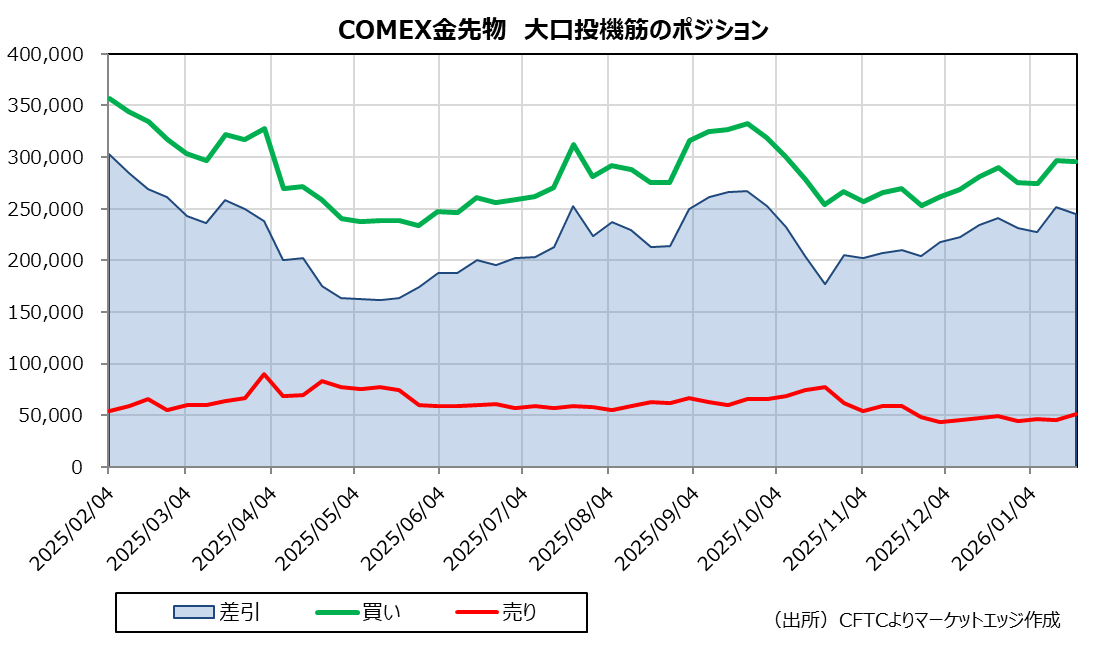 米商品先物取引委員会(CFTC)によると、COMEX金先物市場における大口投機筋のポジション(1月20日時点)は、買いが29万5,772枚、売りが5万1,002枚で、24万4,770枚の買い越しとなっている。これは、昨年10月の調整局面で記録された17万6,609枚の買い越しを上回っているが、昨年9月のピーク時に記録された26万6,749枚には到達しておらず、金相場の過去最高値更新とは整合していない。