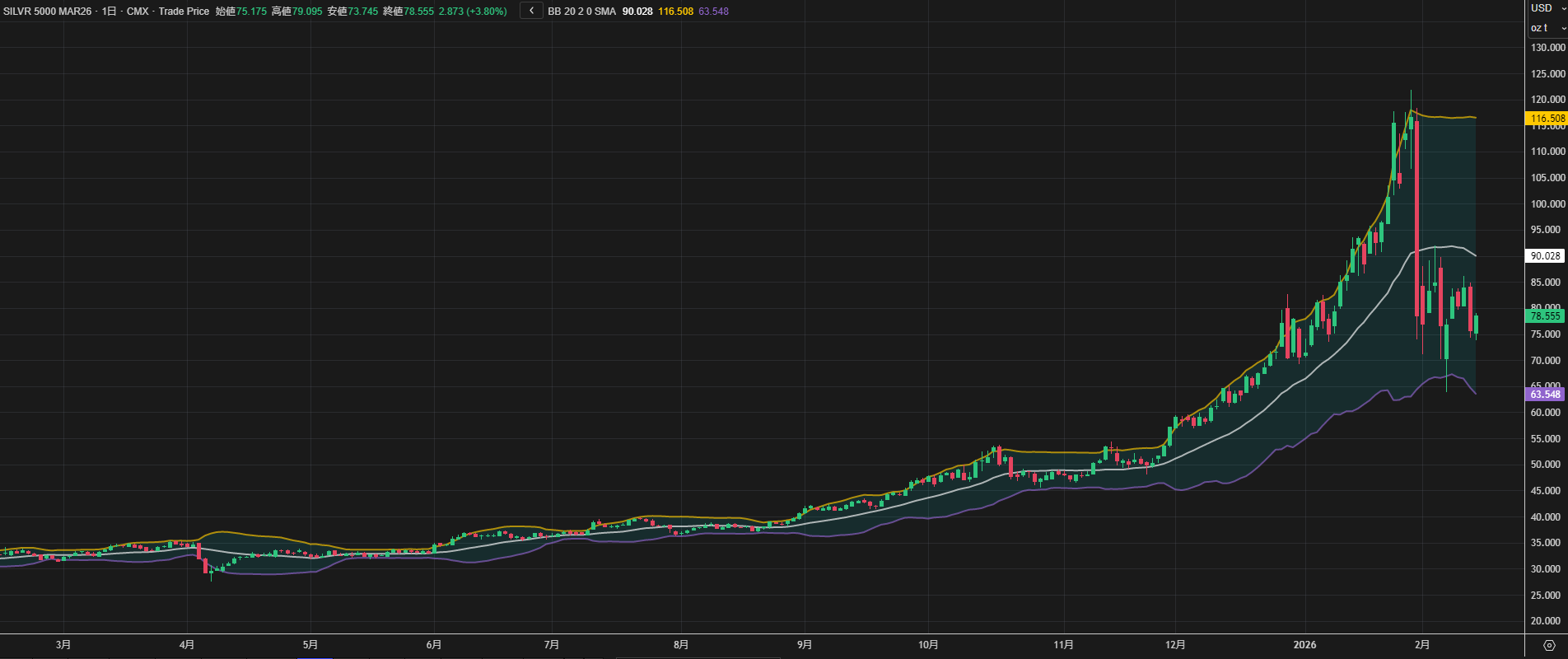 銀価格は不安定な値動きが続いている。COMEX銀先物相場は1月29日に過去最高値更新となる1オンス=121.785ドルまで値上がりしたが、2月6日には63.90ドルまで急反落している。その後は、安値更新は見送られているが、反発力も限定されており、65~90ドル水準に新たな取引レンジが形成されている。金に関しては、2月2日の4,423.20ドルで下げ一服となった後は、5,000ドル水準まで切り返している。既に急伸・急落前のトレンドラインに回帰しており、マーケット環境の正常化が進んでいることが窺える。一方、銀に関しては安値からの反発力の鈍さが目立つ状況にあり、両貴金属の値動きの違いが目立ち始めている。