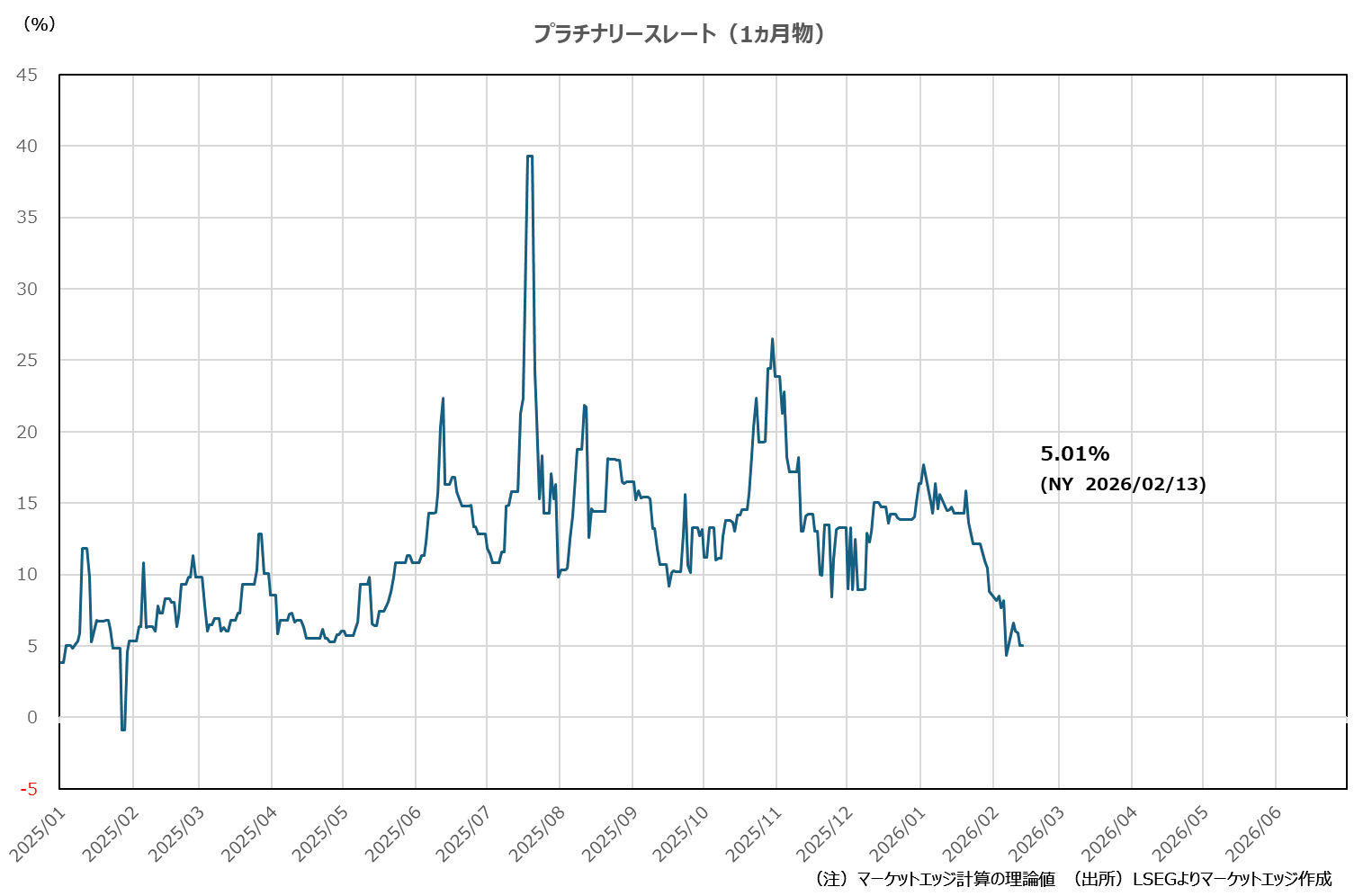 プラチナ相場の反発力の鈍さに関しては、短期需給要因で概ね説明が付く状態にある。プラチナリースレート(1ヵ月物)は1月中旬には15%水準に達しており、1月29日までは10%台を維持していた。しかし、その後のプラチナ相場の急激な値下がりの中で、足元では5%水準まで低下している。価格急落で需要拡大、供給抑制の需給引き締まりは発生せず、逆に需給が緩んでいる可能性が強く示唆されている。