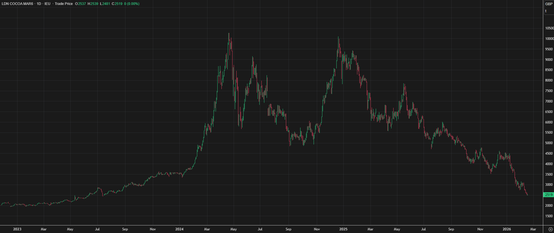 Liffeココア先物相場は1トン=2,500ポンド台まで下落し、2023年7月以来の安値を更新した。2024年には二度にわたって1万ポンド台に乗せる場面も見られたが、2025年に続いて26年も軟調地合が続いており、概ね2023年以降の高騰相場を帳消しにする値下がりになっている。2025/26年度需給に移行しているが、生産が安定している一方、需要は抑制されており、在庫積み増し圧力の発生が値下がり圧力に直結している。