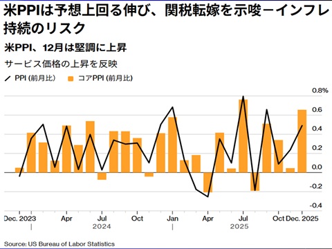 「2025/12月度米PPI(生産者物価指数)」は市場予想を上回る伸び。すなわち、企業がトランプ関税を価格転嫁。いよいよ、来ました。こうなると、インフレ圧力は高止まりどころか、さらに加速します。なぜなら、始まったばかりだからです。