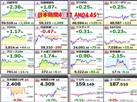 日本時間4/17の米市場でも、いまのとこ、3指数はそろって上昇。Nasdaq総合指数はウハウハ相場。