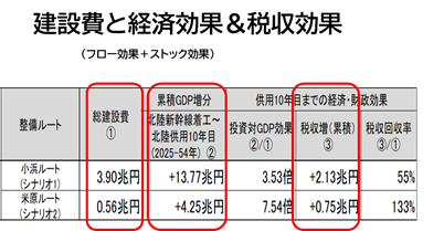 ご覧のように、米原は「安い」けど、経済効果も税収増効果も限定的だけど、小浜ルートの法は「高い」(3.9兆円)けれど、経済効果も税収増効果も圧倒的に大きい、という結果となりました。