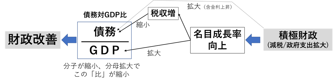 つまり、積極財政は債務を拡大させる側面もあれば税収増で縮小させる側面があり、かつ、GDPを拡大させる側面がある。したがって、これらの影響が総合すると、債務対GDP比が拡大することもあれば、縮小することもあるわけだ。