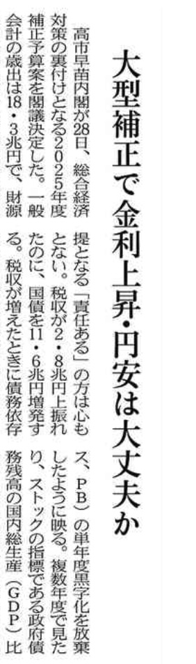 … … …(記事全文2,284文字)高市早苗政権は11月28日、11・7兆円弱の新規国債発行を含む補正予算案を閣議決定した。この経済対策に対し、有力メディアは財政悪化の恐れを言いはやす。財政主導による日本経済再生の好機が到来していることを無視する愚論である。代表例が補正案決定を受けた翌日の日本経済新聞社説「大型補正で金利上昇・円安は大丈夫か」(下コピー参照)である。現実には21日の総合経済以降、長期金利は上昇が抑制され、円相場も落ち着いているにもかかわらずである。