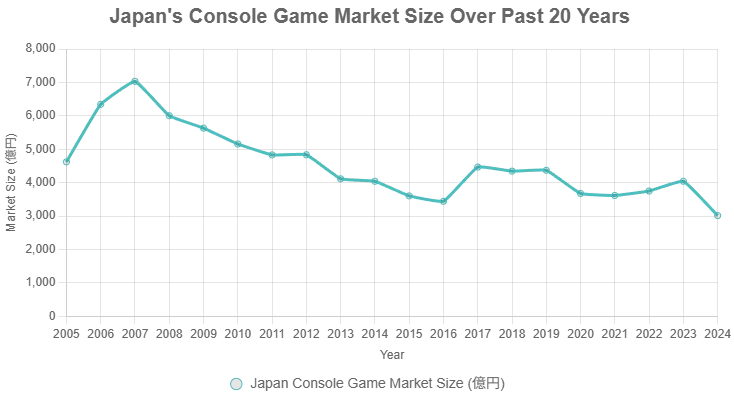 最近はスマホゲームやPCゲームに押され、コンソール型(家庭用ゲーム機市場)は、やや減少傾向にあるが、それでも下記のグラフの通り、4000億円前後は維持している。日本のゲームソフト(日本企業開発・出版)の世界市場シェアは、約15-20%(2024-2025年推定)となっている。