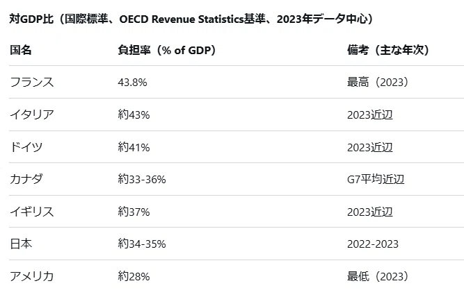 最新の比較可能データ(主に2022年実績、財務省・ニッセイ基礎研究所等に基づく)でG7各国を並べた。フランスの負担率が急上昇し、日本はアメリカ・カナダに次ぐ負担率の低い国となった。