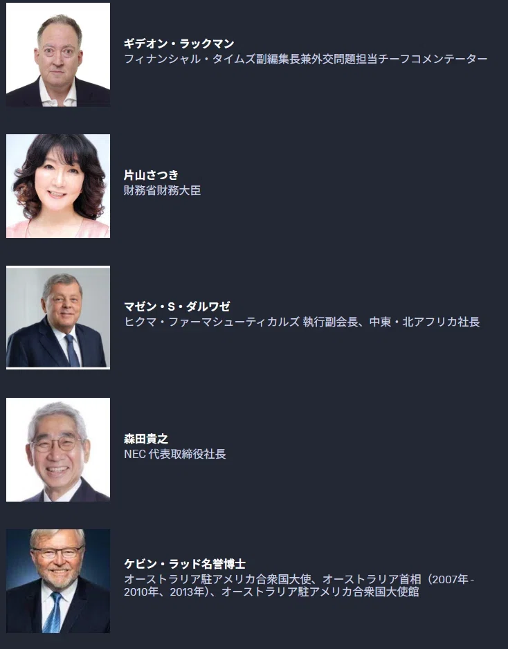 また、非常に豪華なパネリスト陣です。私の右隣はケビン・ラッド氏。元オーストラリア首相であり、現在は駐米オーストラリア大使を務め、米中関係や習近平思想に関する著書も持つ知性派です。 私の向かい側には、日本を代表する、ひいては世界有数のテクノロジー企業であるNECの森田会長がおられます。 そして左側には、日本の長年の友人であり、有力実業家であるマゼン・ダルワザ氏。ヒクマ・ファーマシューティカルズの副会長を務めておられます。