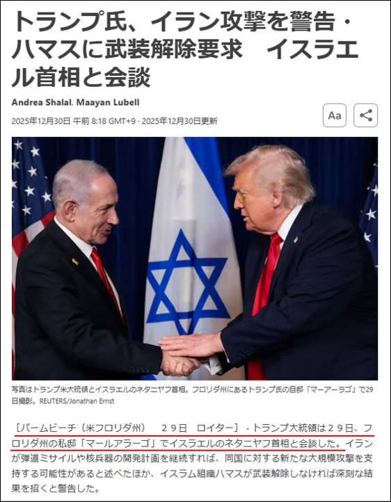 2025年12月29日、トランプとネタニヤフは、イランおよびガザ地区のハマスへの対応について協議を行った。奇しくもイランでの大規模な反政府デモが激化したのは、まさにこの日からである。