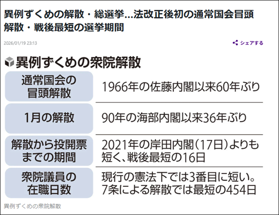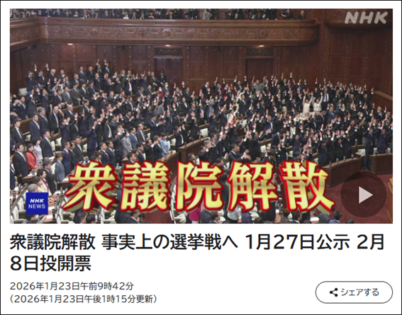 高市首相は、通常国会の召集日である本日1月23日、施政方針演説も予算審議も一切行わずに衆議院を解散した(冒頭解散)。投開票は2月8日。解散から3週間足らずという、文字通りの超短期決戦である。