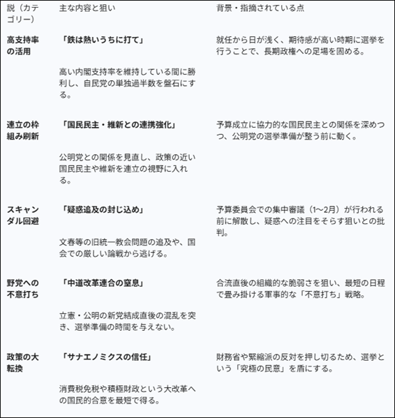 メディアやネット上では、高市首相が1月の衆議院解散を決めた本当の理由について、「高市人気が高いうちに解散総選挙して自民党の議席を回復させたいから」「少しでも早く国民民主と連立するため」「高市首相の旧統一教会スキャンダルの追及を回避するため」「野党に不意打ちするため」「対中関係悪化の影響が出る前に総選挙しておきたい」など、主に国内の政局に起因する諸説が囁かれている。