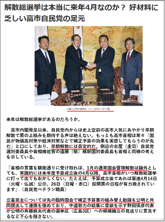 政治家の言葉を額面通りに受け取れないのは常だが、この「舌の根も乾かぬうちの豹変」がもたらす信頼喪失のリスクを、高市首相が承知していないはずがない。自民党のベテラン議員も「1月の通常国会冒頭解散は論外」とし、「早くても4月」とメディアの取材に答えていた。ちなみに下の記事によると、立憲民主党と公明党の合併話は、公明党が自民党との連立政権を解消した時から水面下で進んでいたようだ。