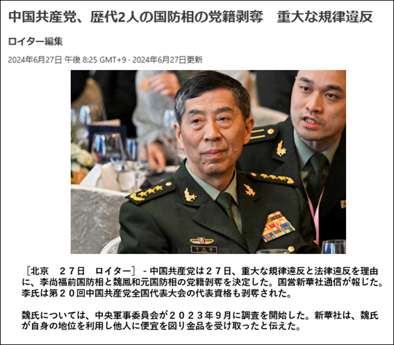 中国国防省は二人の具体的な罪状を明かしていないが、中国の国営メディアは、一貫して習近平政権が長年取り組んでいる「反腐敗」政策の成果だと強調している。この報道が事実ならば、二人は汚職問題や腐敗問題で調査受けている、ということになる。