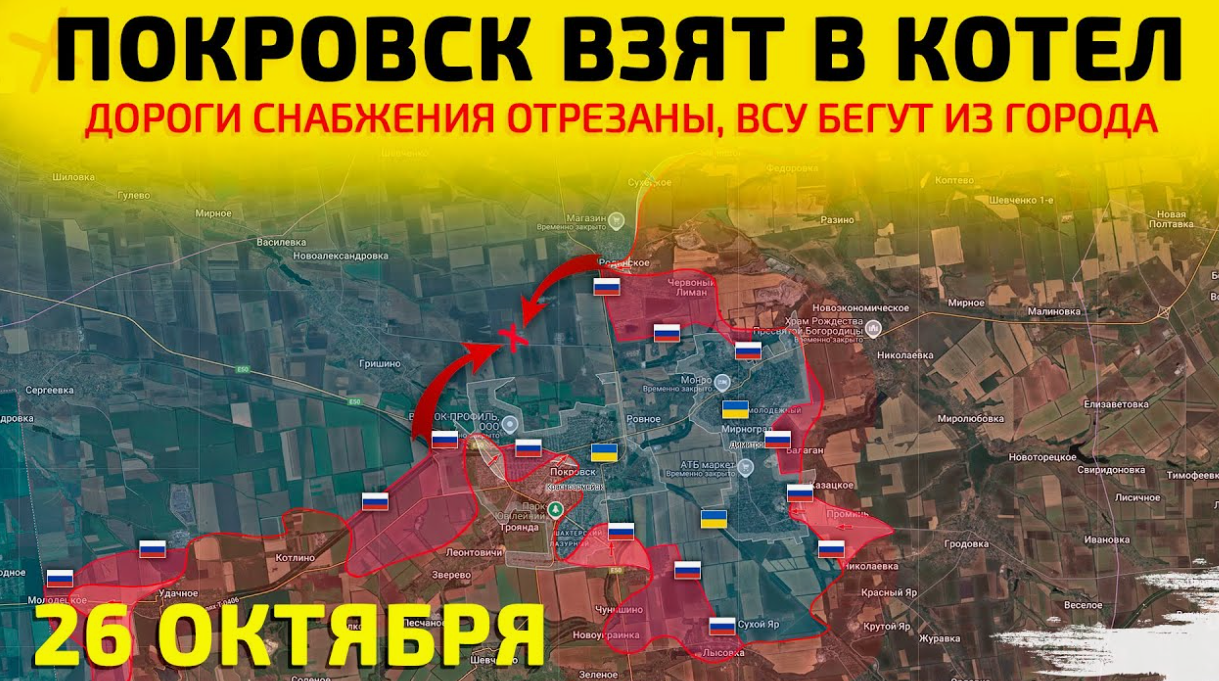 プーチン大統領は26日(日)、軍服姿でロシア統合軍司令部の拠点の一つを訪問し、ワレリー・ゲラーシモフ露軍参謀総長や実働部隊の司令官らと会談しました。この会議の中でゲラーシモフ参謀総長は、ロシア軍の最高司令官であるプーチン大統領へ報告を行いました。まず重要な報告は、Youtubeの「日曜版・戦況」でここ最近、最重要拠点とお伝えしてきましたドネツク州のパクロフスク市、ミルノグラード市でウクライナ軍の完全包囲=大釜を達成したということです。